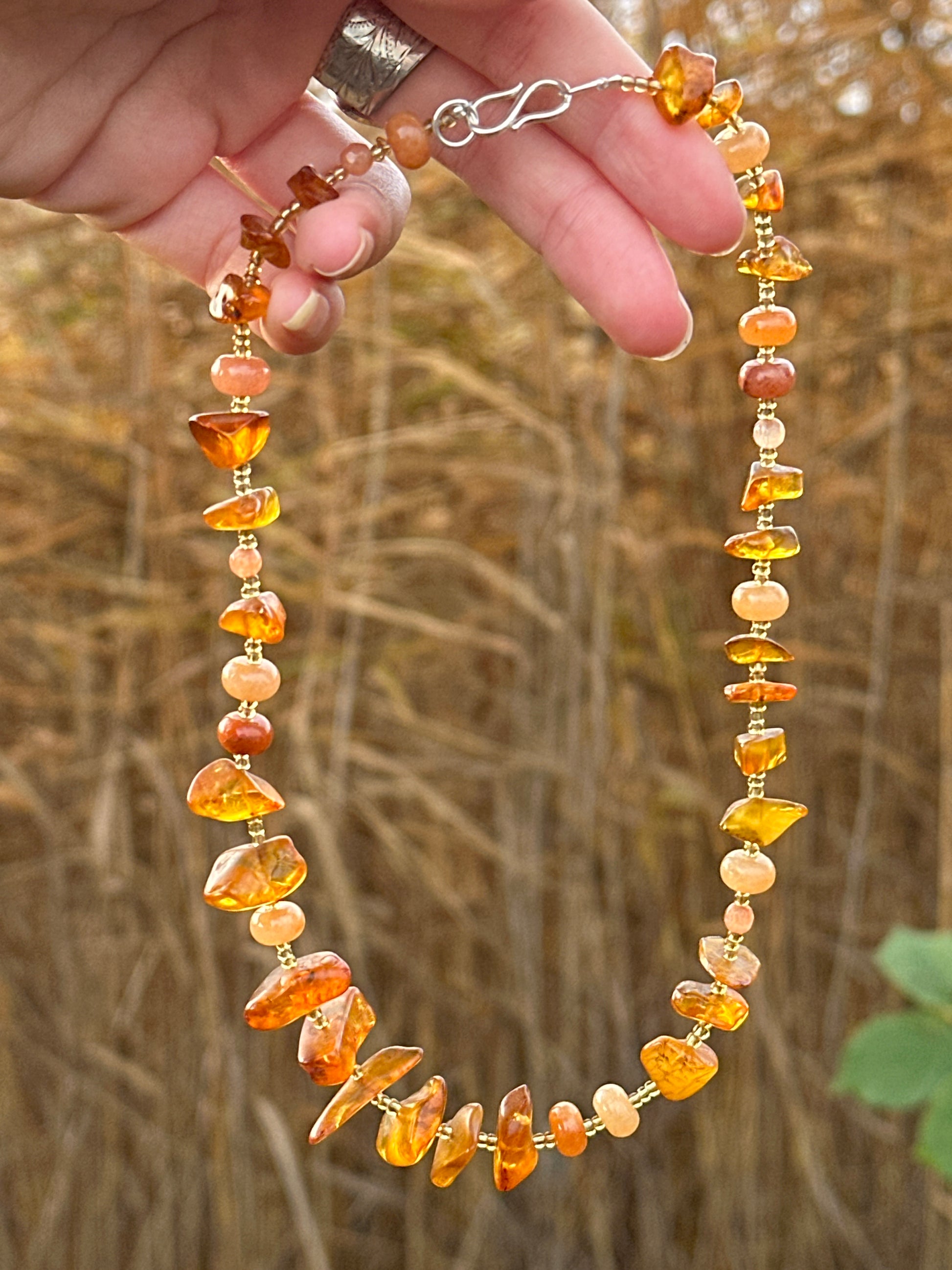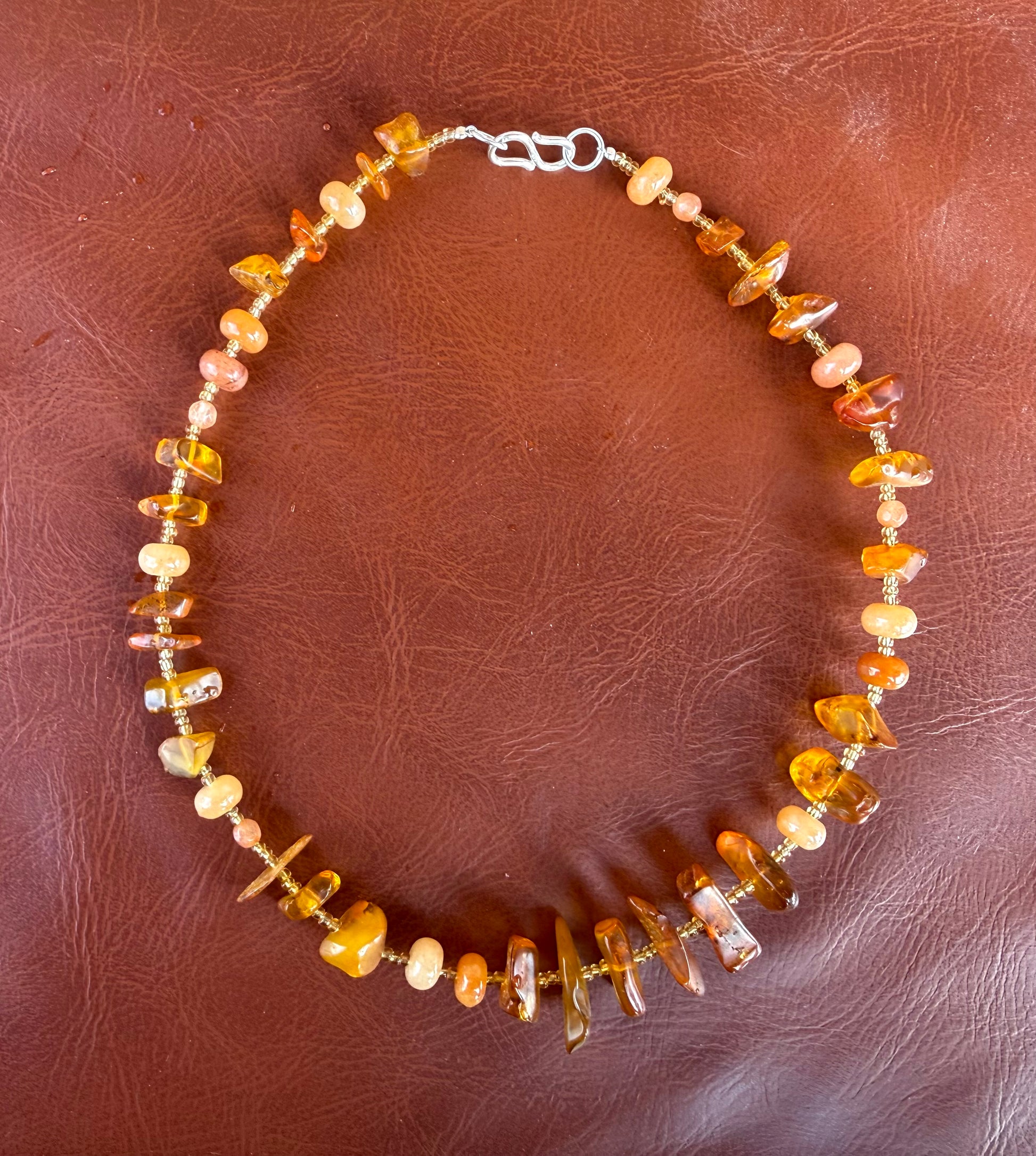 Halskæde udstyret med Sterling sølv S-lås og bestående af poleret rav og rød aventurin ❣️
