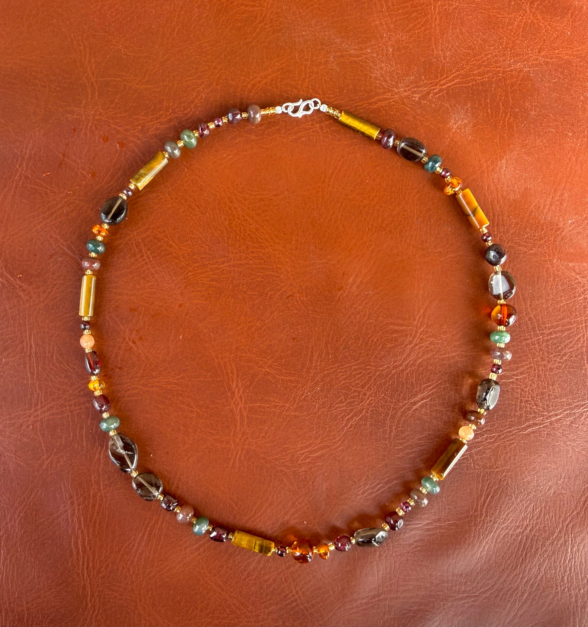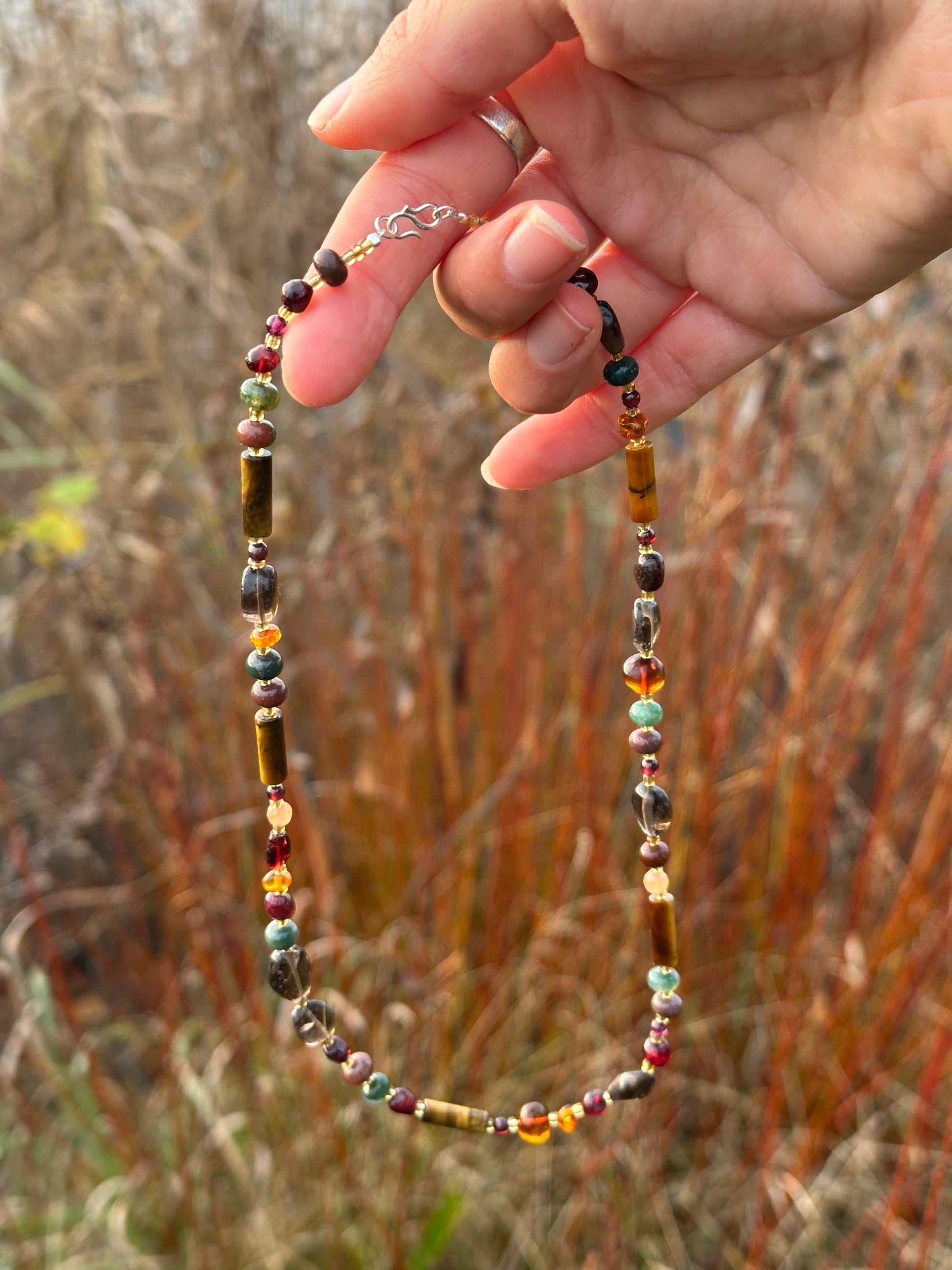 Halskæde bestående af en masse forskellige natursten i varme jordfarver 🍁 Herunder tigerøjesten, poleret rav, røgkvarts og agat.