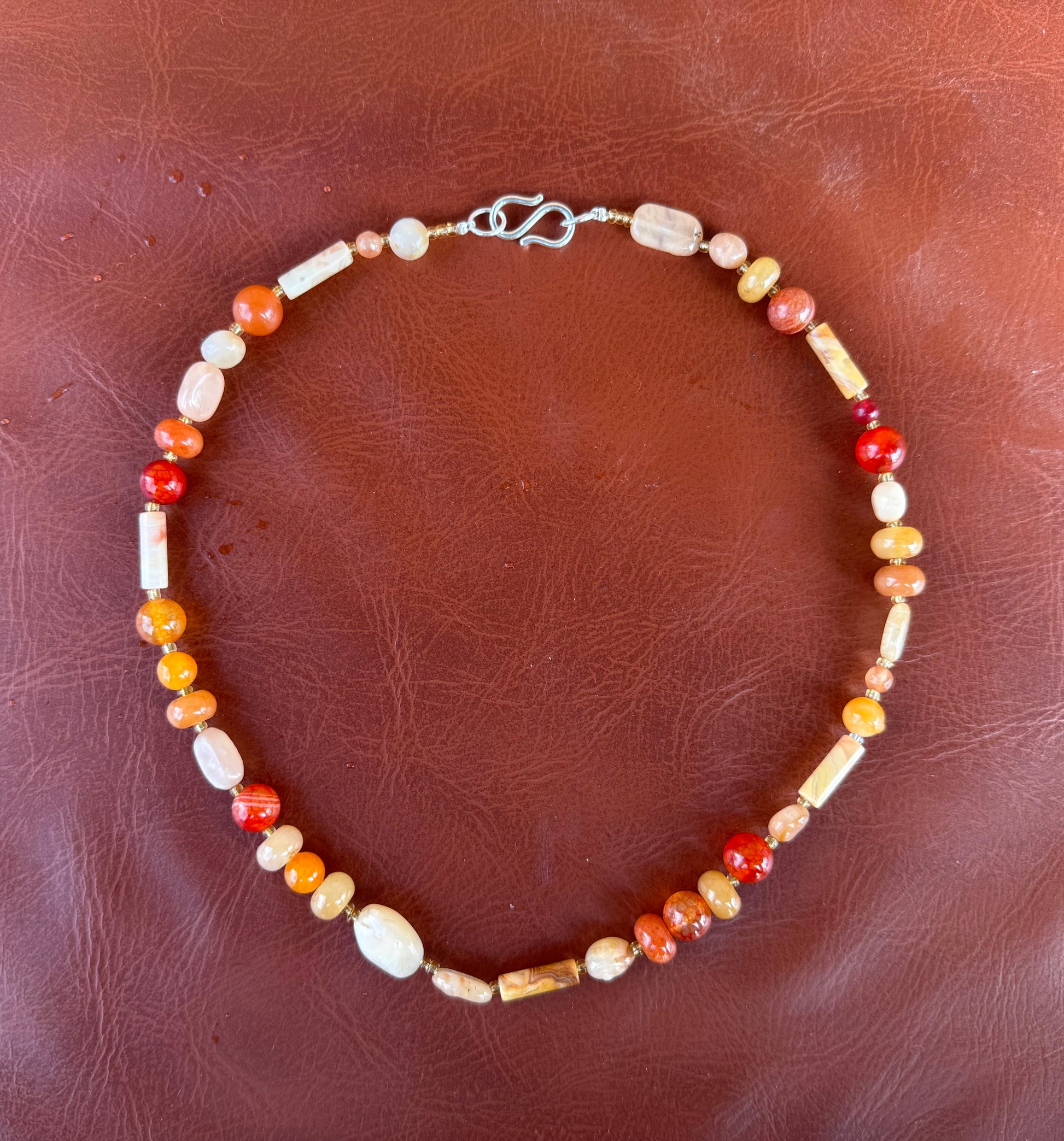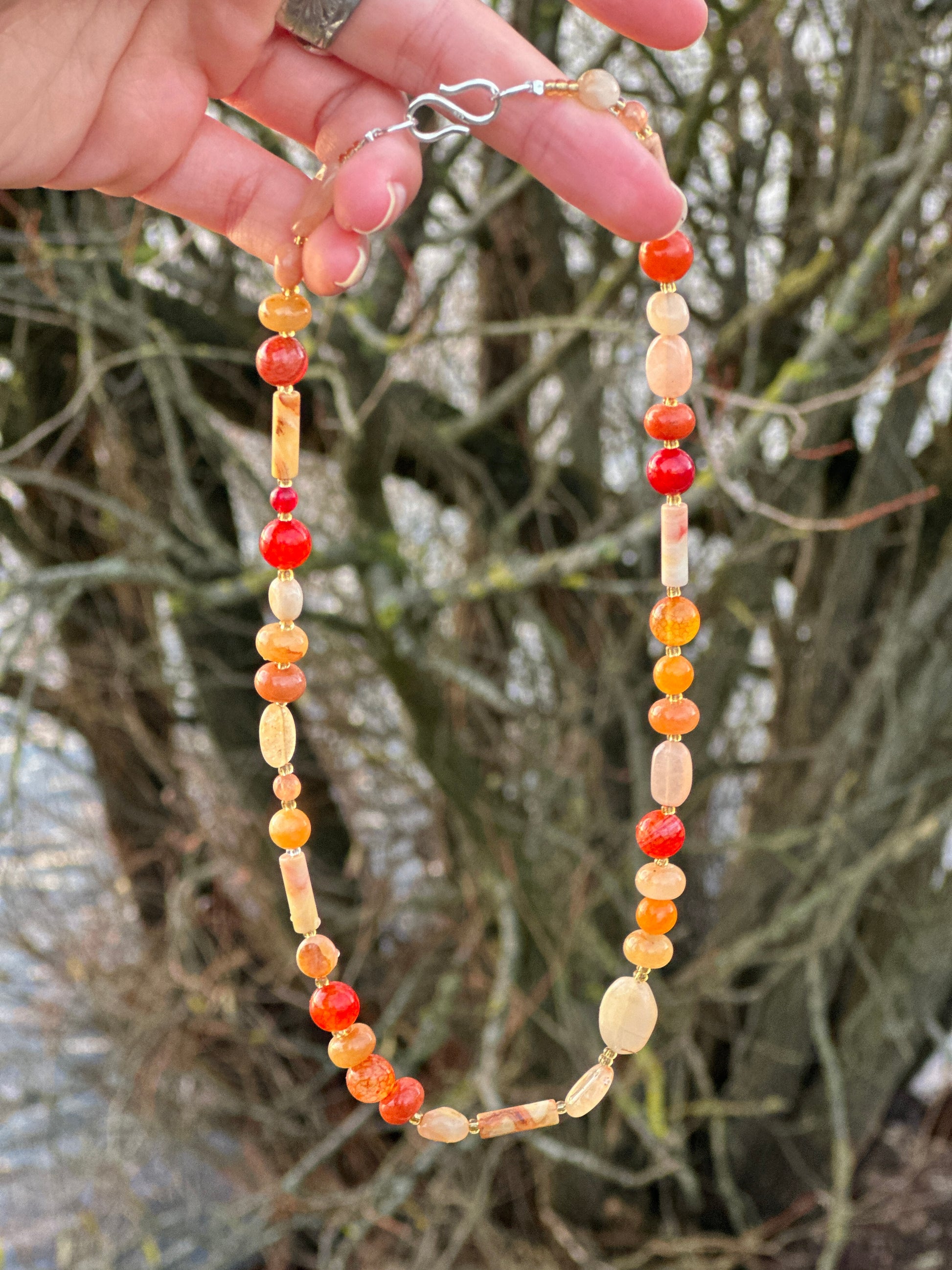 Smuk halskæde med Sterling sølv S-lås og bestående af rød aventurin, agat, og klare kvarts sten🧡