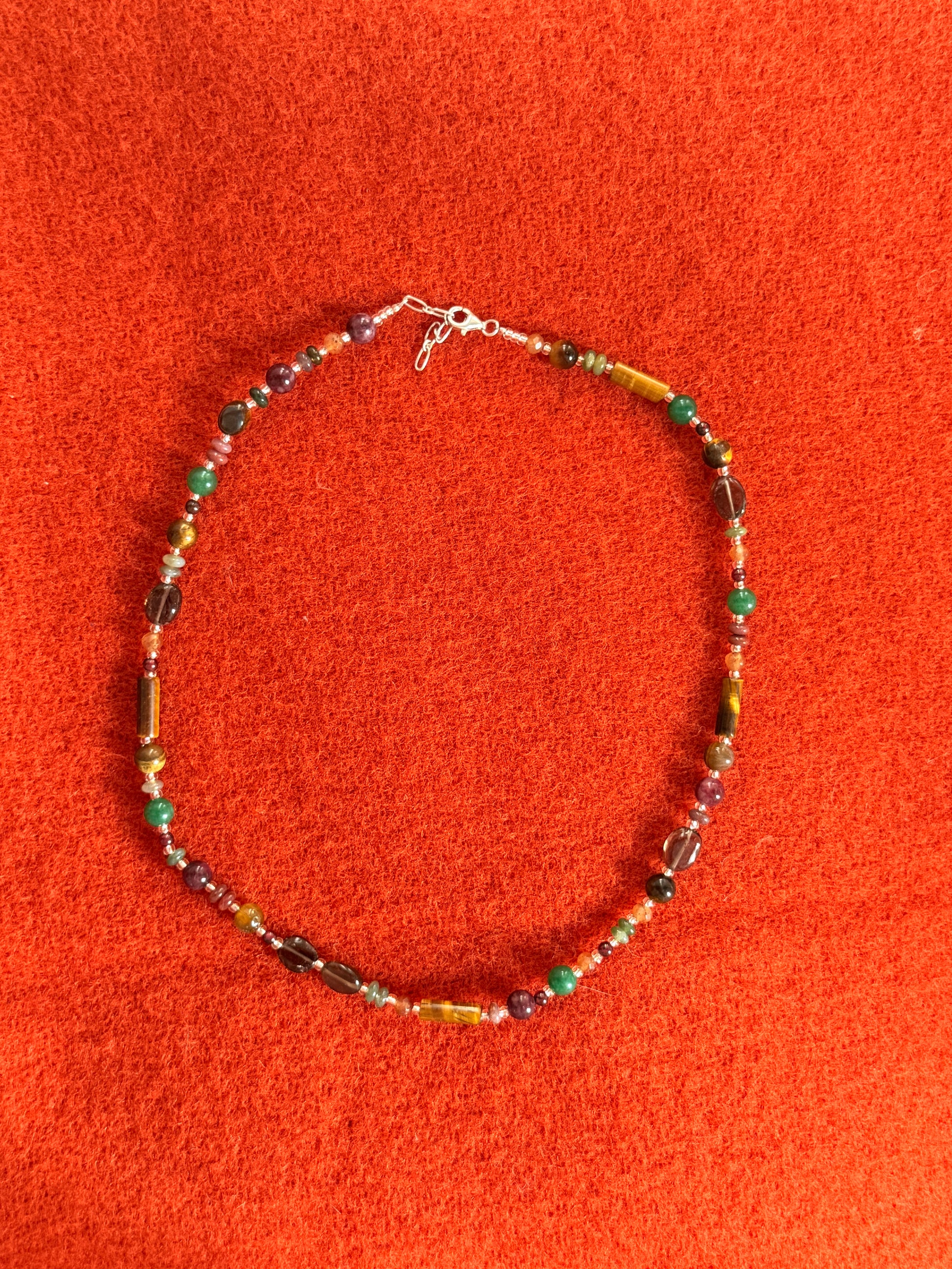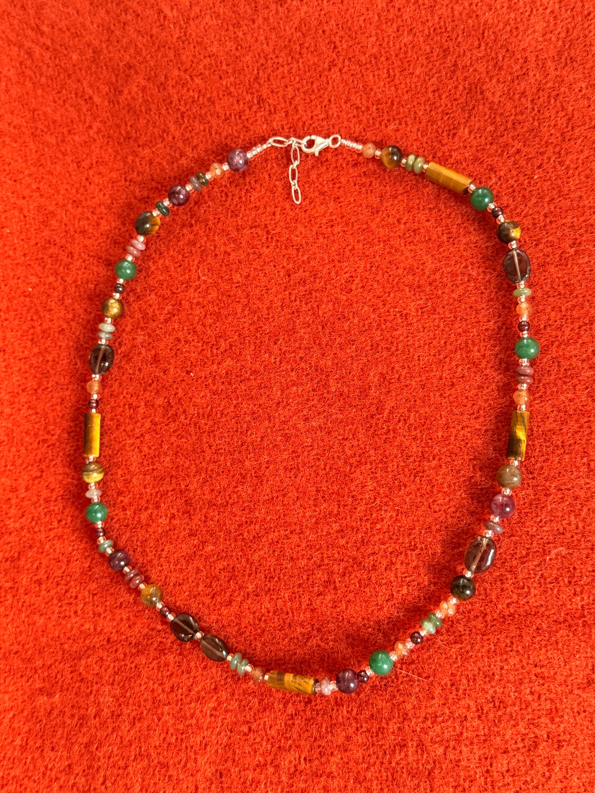 Halskæde med karabinlås og forlængerkæde i sterlingsølv, sammensat af tigerøje, aventurin, røgkvarts, indisk agat og ametyst 🐦🔥